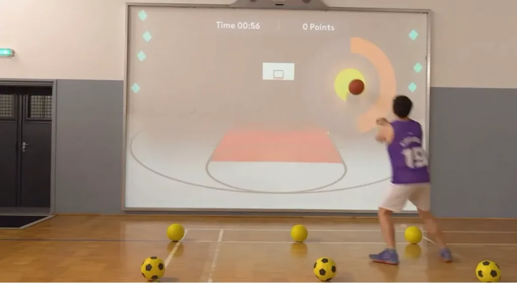 - Diana de Rebote / Wall Targets: Esta es una solución versátil y adaptable. En vez de encestar en un aro físico, se golpea la pelota contra zonas específicas del panel virtual. Esto es perfecto para espacios sin la altura o infraestructura para un aro. Cada impacto correcto genera efectos visuales y puntuación, manteniendo el desafío.